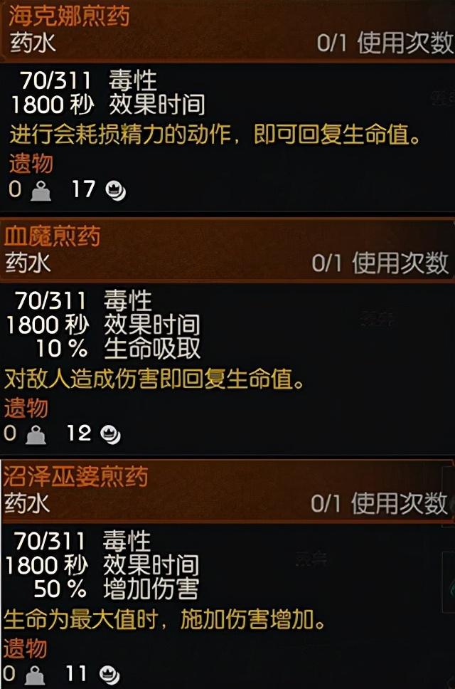 其实杰日天这个瘾头套路并不需要非常后期 大约50-70左右就可以达到大约3W-4W的劈斩伤害而且除了武器对装备没有任何要求二周目50到70之间就可以成型 以后只会越来越强而已瘾头效果根据当前毒素提高每1点毒素*0.75%点攻击力[煎药有效]如果不想玩断裂 更追求伤害可以选择武器活力附魔[生命值全满时将50%的生命回复转换为下次的攻击力]煎药的搭配是总共要嗑4种 [二周目全配方收集后最高毒性上限为313]海克娜 [消耗精力恢复10%生命值]血魔 [攻击吸血10%]沼泽巫婆 [生命值全满时提高50%伤害]另一瓶煎药随意选择协同作用技能激活后 4瓶煎药可以提高4000点生命值上限至于为什么不用忍耐疼痛是因为 虽然+的血上限更多 但是耐性提高不掉血下 是没效果的如果用忍耐疼痛掉血了就没有生命值全满提高的伤害 所以抛弃生命回复+瘾头210±20%+雷霆+怒气爆发提供的伤害非常客观