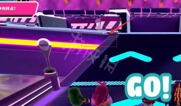 终点线前的这个斜坡,可以利用这个拨杆,在拨杆中间或者靠上位置等着被拨杆推上去,如果站在靠下的位置,容易被推到旁边的固定障碍上。