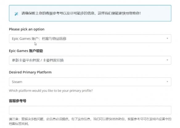 如果在启动游戏前忘记绑定了steam账号,启动游戏后发现自己已经变成新号了。玩家可以找客服帮助或者前往糖豆人客户支持网站填写表单上传问题需求,表单内容如下,需要提供游戏中的客服参考号。这里提供一下申诉网址,需要先登陆epic账号。