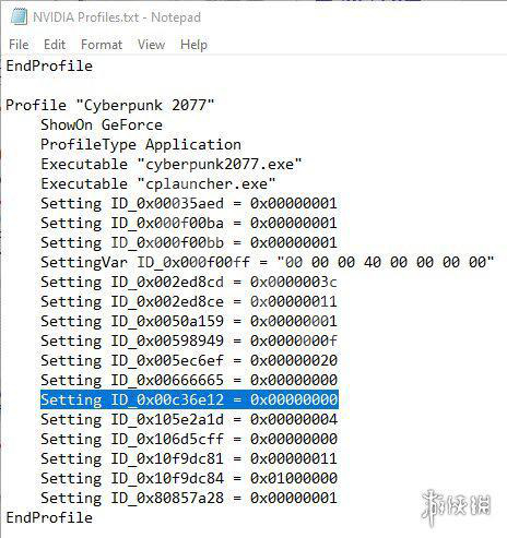 5,搜索“Cyberpunk”关键字,在下方新建一行,把“Setting ID_0x00c36e12 = 0x00000000”复制粘贴进去。