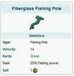 5.玻璃钢钓鱼竿:27%钓力,在丛林里由荧光砖做成的神殿里有几率出现的常春藤箱里找到,在有能力买坐鸭钓竿前是最好的钓竿。