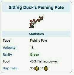 6.坐鸭钓竿:40钓力,用35个金币从游商处购买。钓竿有几率在游商的出售界面中出现。它是最常用也最实用的钓竿,获得也比较容易(35金不算什么的,打3~5次大脑或世吞就够了)