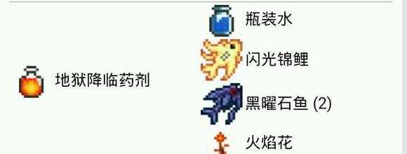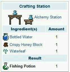 药水可以让钓鱼事半功倍。1.钓鱼药剂:粉蝶花*1+脆蜂蜜块*1+水瓶在炼药台上制作。作用:+15%钓力。