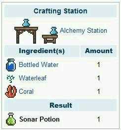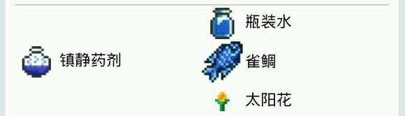 3.声呐药剂:粉蝶花*1+珊瑚*1+水瓶在炼药台上制作。作用:可以看到你将钓到的东西。