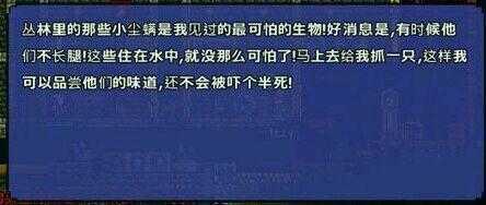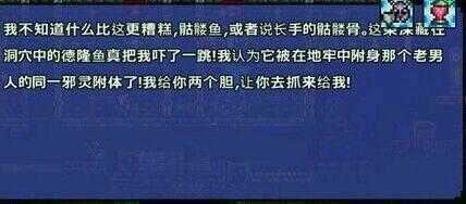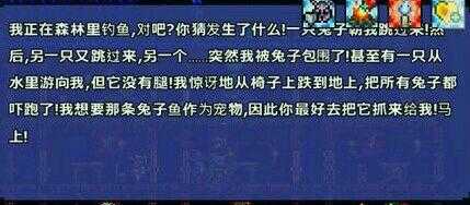 Tip8.快速完成钓鱼任务的方法:初级:一次钓够大量的鱼,存在家里,以后做到相同任务时可直接取存货交差,省去以后钓鱼花的时间可用作其他事。这个方法需要用到辅助道具,储蓄罐或者保险箱。每次钓到任务鱼立刻存入保险箱,只要保持身上没有任务鱼的状态,就还能继续钓到任务鱼。之后回家把保险箱里的鱼存到家里的箱子里。注:这个方法只能省去一些钓鱼的时间。总的任务完成所需时间不变。高级:推荐装备:快速交通工具,高级钓鱼工具药水等。在利用方法二收集到足够多种类的鱼之后,开始把鱼分别取少量存在保险箱里,然后不断开新图,火速赶到海边找熊孩子接任务。一般任务鱼可直接在保险箱取用,一个地图可以完成一次任务。大概一个图在两三分钟左右吧。但是万一任务鱼没有库存,用工具可以在任意地方造出水域,可以补充缺少的鱼。终极:开人物法与前一种开地图不同的是,开人物不管在速度还是稳定性上都有了很大提升。偶然发现,只要是在某个世界的同一天,所有角色在那天接到的任务都是一样的。利用这点,只需要主世界一个世界。早上4:30,也就是新一天开始,先用大号接个任务,然后去钓鱼,别急着交任务,用方法二不停刷,直到留个半天不到的时间。(钓鱼效率尽可能高,就是装备一套,药水,大水域尽量都符合)这样钓下来假设钓了四五十条,然后存到熊孩子房间的一个箱子里。(建议熊孩子房间靠近出生点)然后就开始开心的刷任务了。建新角色进地图,从箱子拿条鱼,交个任务,平均每次任务耗时15秒。理论上(注意只是理论上)一天50条鱼,200条4天,4天96小时也就是现实96分钟。一个多小时可以完成200个钓鱼任务。这些方法的问题在于。当你在游戏中退出载入新地图或者新人物时,程序是不会自动清除内存的。所以要是你电脑内存吃不消的话,人物或地图刷个几次内存就爆了,然后泰拉就会死机,跟系统一起强退。之后你需要熬过强退的时间,重启系统和泰拉的时间,这些时间加起来反而比游戏中花的时间还长。建议的解决办法是,看一般加载多少次后内存会爆出(也可用任务管理器监测内存使用量),在内存占用量很大时自己退出游戏再重启游戏(这样消耗的时间比死机重启少得多,只要没有开云存档自动同步的话)