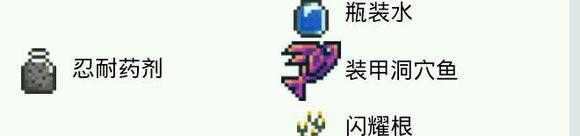 2.板条箱药剂:琥珀*1+死亡草*1+月光草*1+水瓶在炼药台上制作。作用:增加钓到板条箱的几率。
