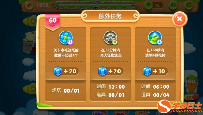 进来的界面就可以看到委派任务的要求要我们电风扇形状的防御塔不可以超过一个,在十二分钟以内也必须干掉地方怪物的堡垒地,还有在三分钟以内清理掉障碍物松树四颗,那么熟记了任务就可以开始通关了,在敌方人物出现的地方选择飞机形态的防御塔,它的射程范围很大并且有穿透类型的特性不,让我们在攻击敌方怪物的同时顺带可以将怪物同一侧的障碍物品一并进行处理,有了多余的萝卜金币就在障碍物品多的地方建立一座太阳形态的防御塔,它的特性就是拥有圈形的攻击模式,并且可以在攻击之后造成持续的灼烧效果,到了中间过渡的时候飞机形态防御塔勉强也支持不住了,就再建立一座水瓶形态的防御塔,它作为障碍物小能手可是非常的给力的,拥有超高速度的攻击频率,造成的伤害勉强也是很可观的,松树障碍物陪我们清除掉后就会出现两个枕头类型的防御塔,有了这个助力我们勉强可以放宽心了,怪物堡垒附近建筑防御塔有怪物出现就攻击怪物没有我们就集合攻打堡垒。