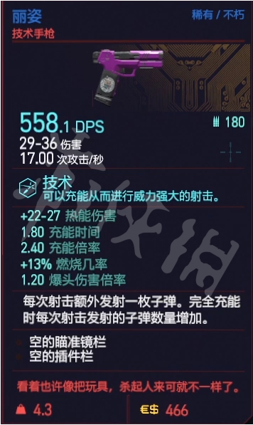 前期神器,在奥马哈等级没达到秒充能时它是最好的手枪,额外多出的一发子弹即使不充能也有很高的伤害,并且射速和奥马哈一样很快,燃烧几率高,最大的缺点就是充能设计时枪口抖动幅度很大
