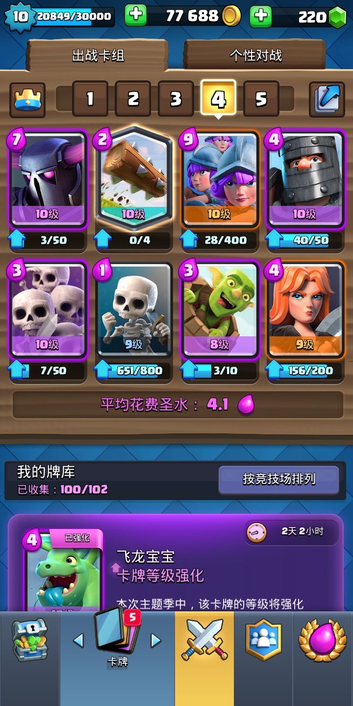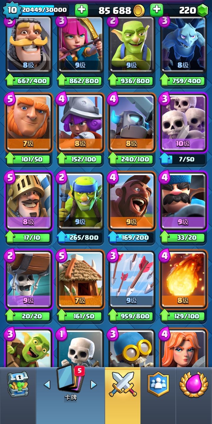在游戏的第六阶和第七阶竞技场,完全是一个新手迈向高玩的一个适应过程。在这个过程之中,需要融入一些战术技巧了。不仅仅是卡组如此简单。在这个阶段当中,卡组的选择可以使用高防单攻的皮卡再加上三个火枪手。这波操作能够让皮卡在敌人群攻之下解围的同时,配合一些群攻类卡组还可以在数十秒的时间内解决公主塔(这里需要看情况,若是对手有火球术就难说了)此外,复仇滚木可以加到游戏卡组当中,这是一种堪称小闪电般的存在。更重要的是其致伤范围大!当然,这是一种传奇卡牌,没有也很正常。至此,就可以考虑黑暗王子这类卡牌了。在此基础之上,再配合上一些群攻或是规模性攻击的卡牌,再学上一些“心理招数”,就可以顺利度过这一阶段。
