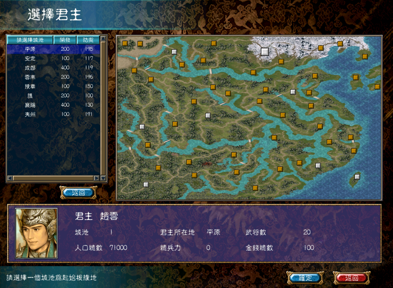 至于地点,选夷州是最偏远的,比较适合发展,其他地点也是可以了,开始城池里面21位将领都在的话,那么敌方一般不会进攻,需要等很长时间敌将够了才会进攻,这个时间点就是发展的时间。