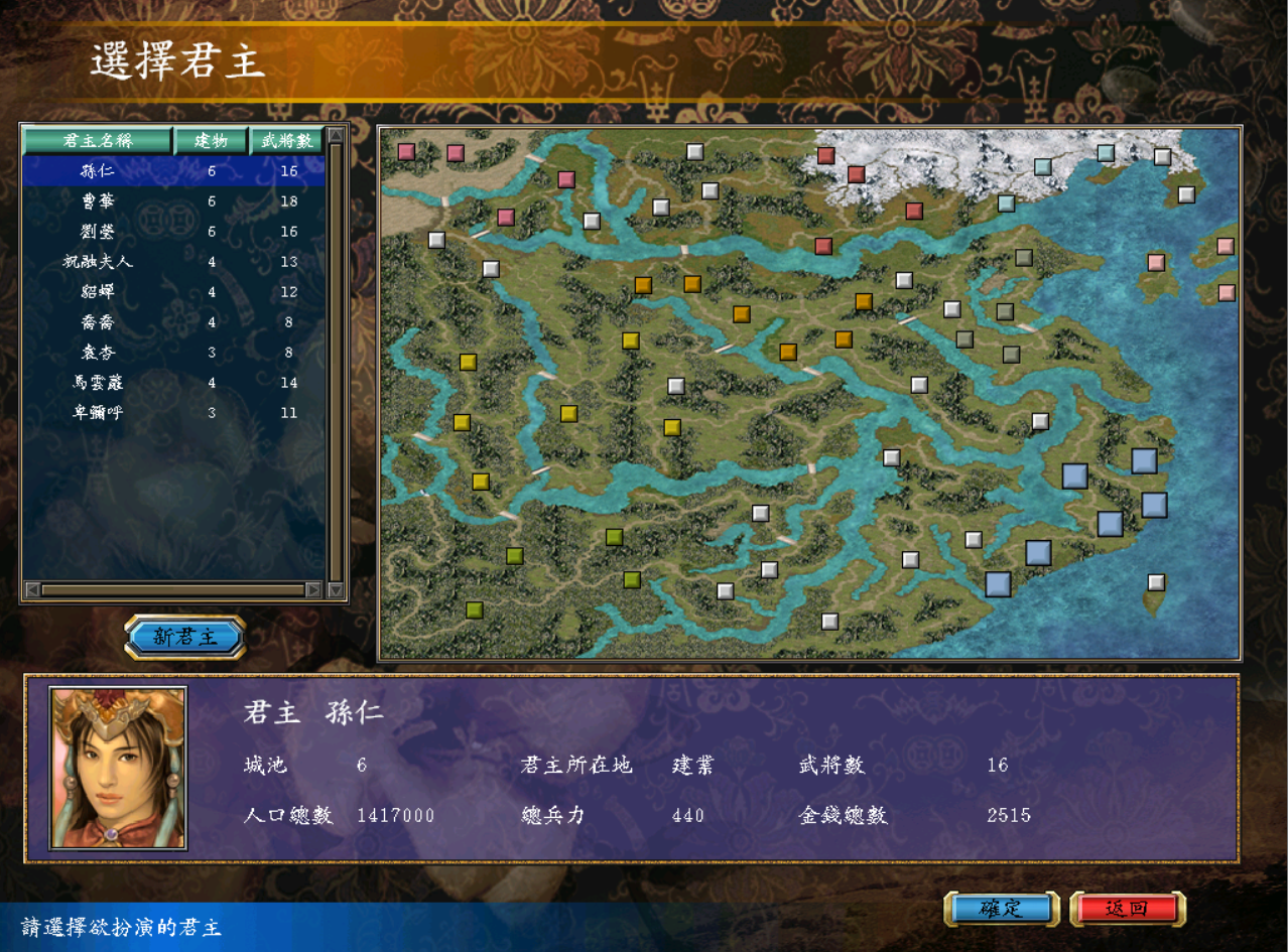 这个剧本可选君主一共有9位,分别是孙仁、曹华、刘莹、祝融夫人、貂蝉、乔乔、袁杏、马云萝、卑弥呼。