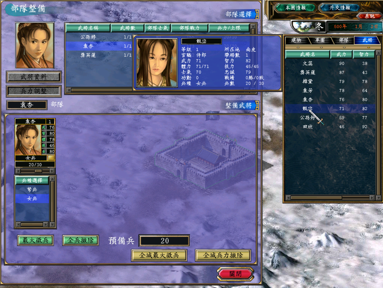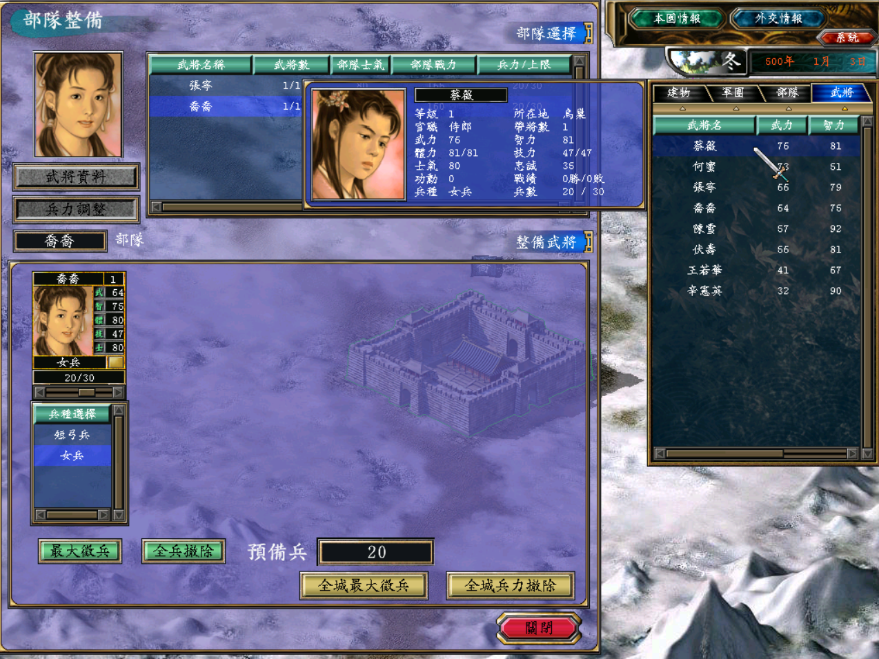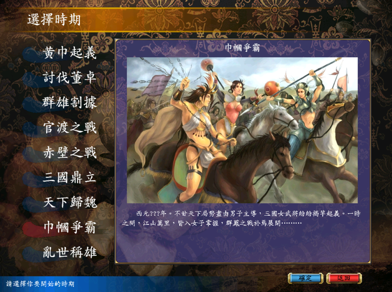 《三国群英传5》新增了一个剧本,那就是巾帼争霸,最开始我以为这个剧本就是女人之间的战争,但玩过后才知道不是自己想的那样,虽然一开始只能选女将为君主,部下也全部是女将,但是之后可以通过搜索,找到男性将领,最后又变成男人之间的战斗,所谓的巾帼争霸实际上是个幌子,只是让女将全部登场,但不代表就是女人之间的战斗。