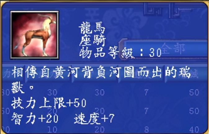 龙马在游戏中的属性:技力上限+50,智力+20,速度+7,忠诚+30。和四不像一样,都是加智力的,但属性上比四不像更好一点。