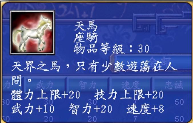 天马在游戏中的属性:体力上限+20,技力上限+20,武力+10,智力+20,速度+8,忠诚+40。偏向武将,更适合文武双全的将领装备,比如赵云姜维等。