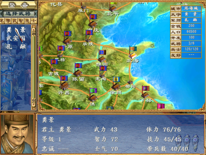 游戏中的龚景占据北海,算是孔融的上司,本身实力很弱,一般不能引起玩家的注意。