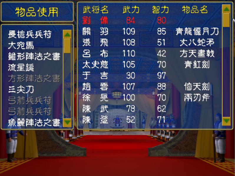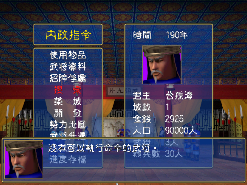 但不知道大家当年发现没,有个方法是可以一开始就让一些本不可以搜索的将领能搜索,那就是给将领装备武器,让他的武力达到85。比如说曹操,一开始把倚天剑卸下来给曹洪装备,那么曹洪就可以搜索了,等曹洪搜索过后,再把倚天剑给乐进装备,那么乐进又可以搜索,之后再给李典,这样在游戏一开始就能让6人参与搜索,一下就解决了搜索人员不足的问题,一开始可以用这个方法的君主有董卓、曹操、孙坚。至于刘备,开始并不能用这个方法,至少要一年后才可以用。顺带说一下,不用担心临时配装备给将领让他参与搜索搜不出东西,实际上是可以搜到物品或者将领的。