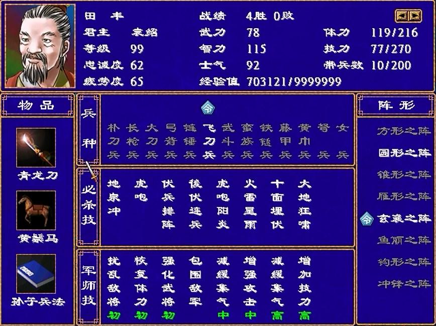 但他是智将啊!最强军师技能居然是姜维、诸葛亮之流才有的“增加技力高”。就这三个技能,他足以成为《三国群英传2》中的天花板级别的人物了,无论是当武将还是军师都非常完美。