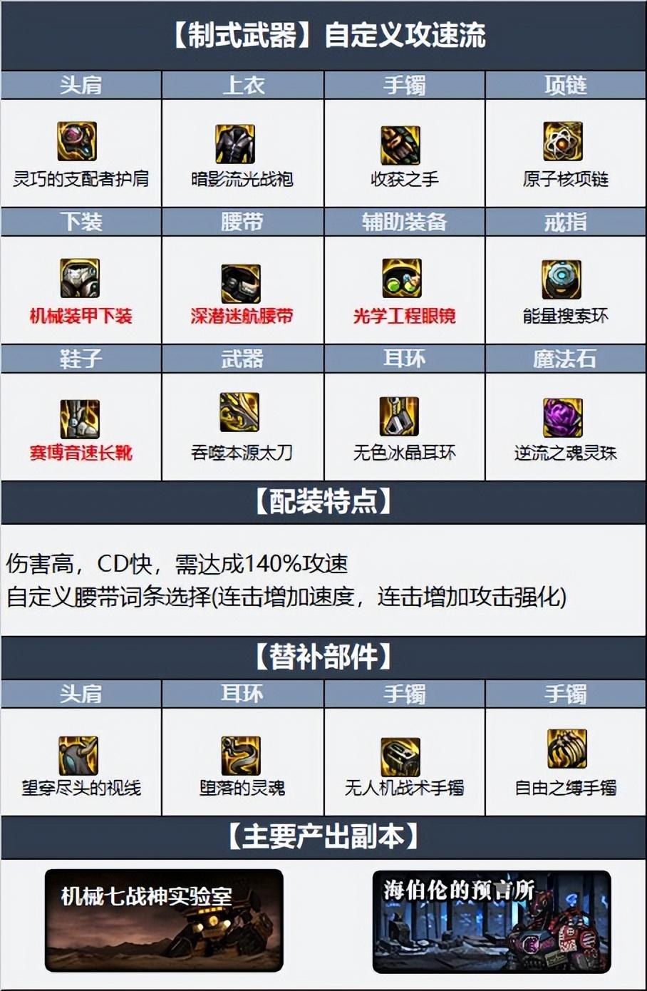 【配装特点】:伤害高,CD快,需达成140%攻速,自定义腰带词条选择(连击增加速度,连击增加攻击强化)