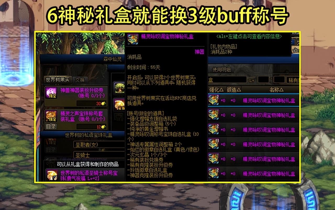 首先,如果玩家想要获得buff称号,可通过购买神秘礼盒来获得,神秘礼盒开启后可获得2个世界树果实,而只要购买6个,获得12个神秘树果实兑换精灵之声宝珠称号套装礼盒,就可以获得1个3级buff称号。
