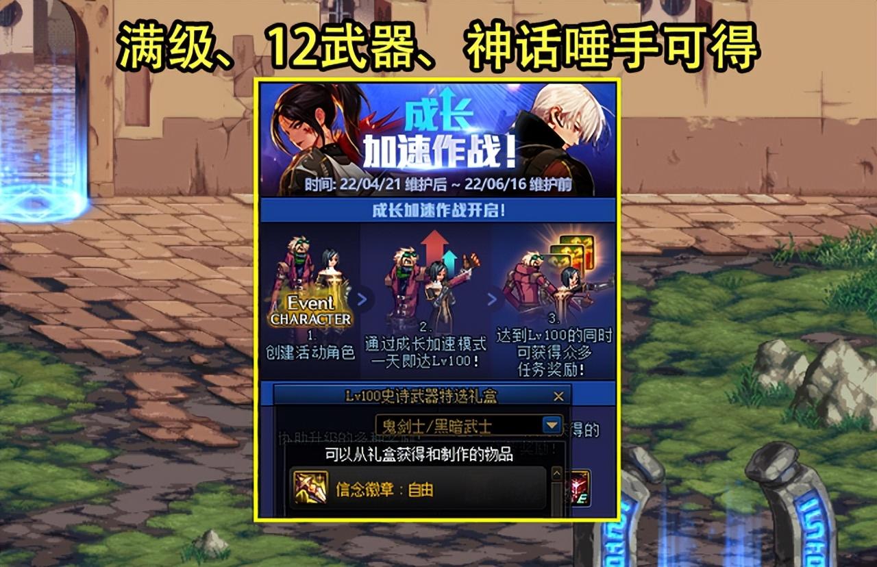 成长加速作战是五一版本最给力的活动之一,不仅升级快速,1级升到100级只用2个小时,同时在升到满级之后,还赠送+12锻8的100史诗武器,以及在达到基础任务4阶段之后,还能获得1个可以自选神话的神话自选礼盒。