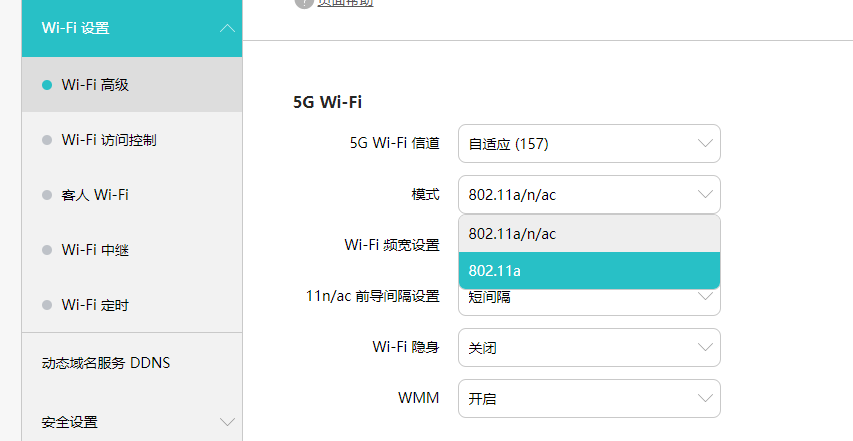 3.点击WIFI设置---wifi 高级 将模式调整成 802.11a