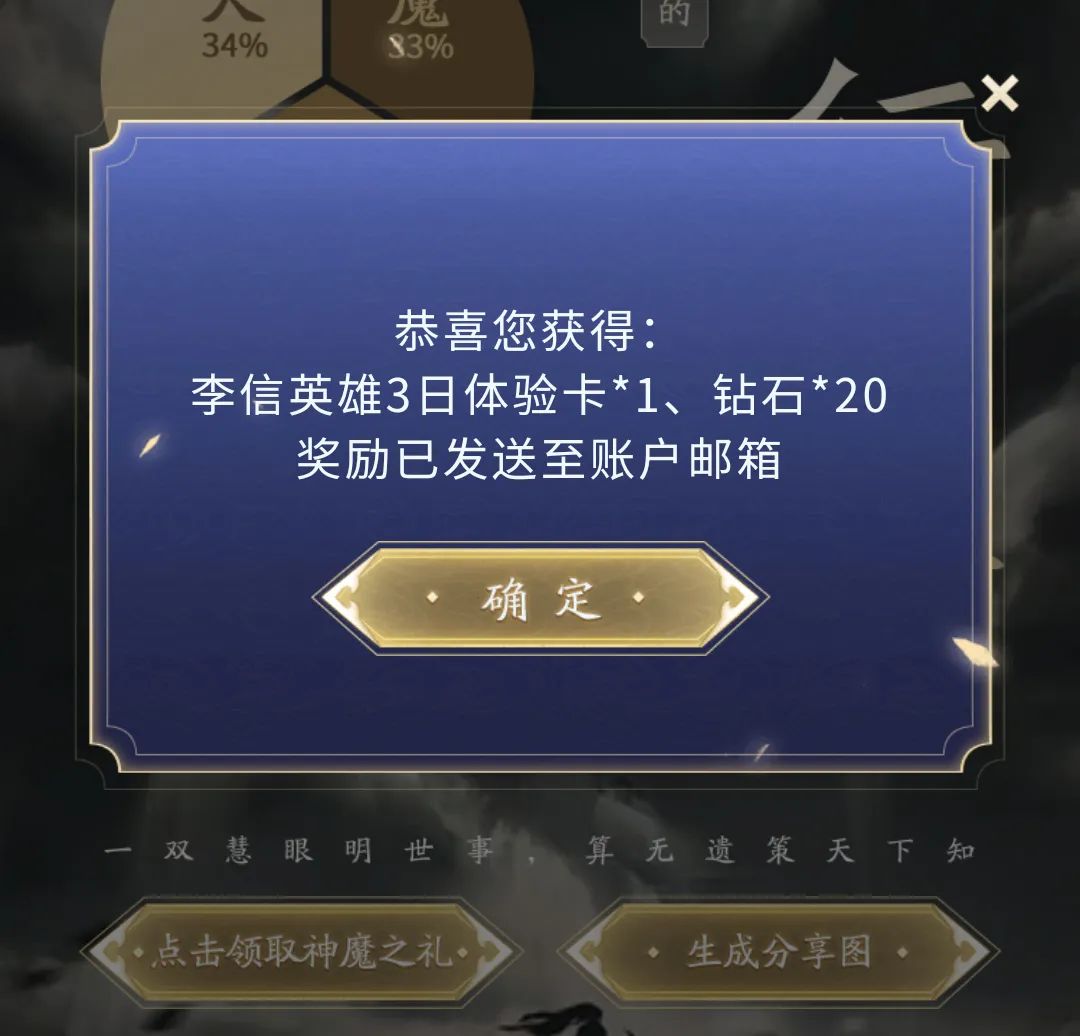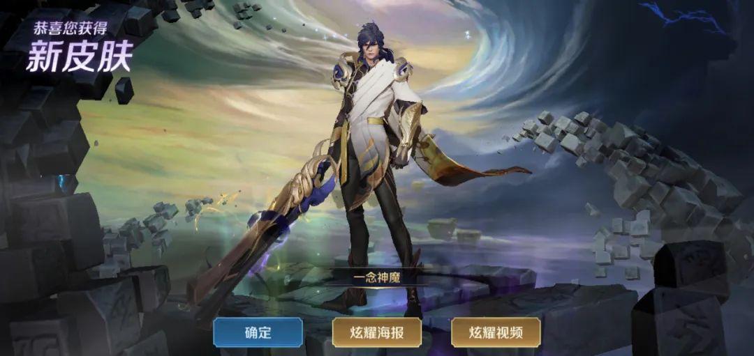 图片生成之后便可以领取奖励了。有概率是可以拿到一念神魔的,但是这个概率,可想而知了,应该没多少人能拿到吧。基本上应该都是钻石奖励。除非运气爆表,或者欧皇附身。如果有人在这个活动拿到了一念神魔皮肤,记得要好好炫耀一番哦。