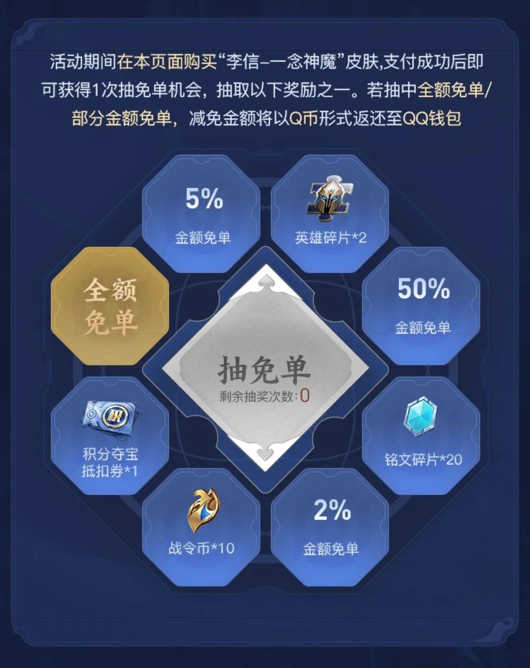 李信的世冠皮肤一念神魔,品质贵为传说,而且一套抵三套,还是值得入手的。但是如果你是零充或者微氪档,传说皮肤让你望而却步,其实也不必在意,因为你还有机会白嫖这款李信的一念神魔。但是需要时间和运气。