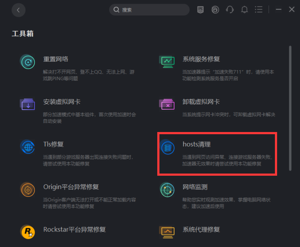也有许多的小伙伴们通过了修复hosts的方式,解决了问题,网络上面修复hosts是文件的方式都比较复杂,在奇游里面操作是最简单有效的,玩家们只需打开奇游的工具箱页面,在里面找到hosts清理,基本上只需要几秒就可以完成修复哦。