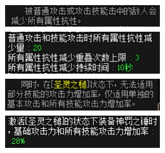 7. 神罚之锤改版可以全程持续了,装备神罚之锤后可以对怪物攻击,最多减少60点所有属性抗性,而且等级增加后并不会增加减抗,所以点1即可。另外神罚之锤减抗不适用于审判系。
