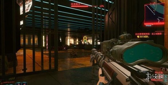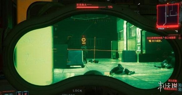 找到位于远处的赛博精神病典夫,你可以使用远程武器射杀他,难度比较低,不过这名敌人有大概率会往里面的车库跑。