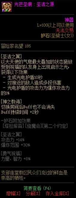 护石效果:以大天使气息最大叠加的状态施放受到祝福的队友身上出现启示之光,获得光电护盾持续10秒,对接近的敌人造成多段伤害,光点护盾的攻击力为爆炸攻击力的1%,切换房间后[神之教诲]buff也不会消失,持续时间+2秒;护石附加效果,[圣洁之翼]攻击力+14%,爆炸范围+30%,[勇气祝福]力智+8%