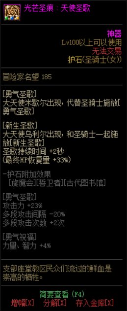 护石效果:大天使米歇尔代替圣骑士施放[勇气圣歌],大天使乌利尔和圣骑士一起施放[新生圣歌],圣歌持续时间+2秒,最终HP恢复量+33%;护石附加效果,攻击力+23%,多段攻击间隔-20%,多段攻击次数+2兹,[勇气祝福]力智+4%