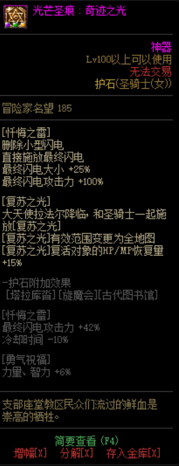 护石效果:删除[忏悔之雷]的小型闪电,直接施放最终闪电,闪电大小+25%,闪电的攻击力+100%,施放[复苏之光]变更为和大天使拉法尔一起,且有效范围变更为全地图,复活的对象血/蓝各+15%;护石附加效果,[忏悔之雷]最终闪电攻击力+42%,冷却时间-10%,[勇气祝福]力智+6%