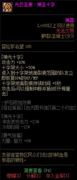 护石效果:[神光十字]攻击力+10%,十字架大小+30%,队友进入十字架造成的裂痕范围,可恢复18%的血/蓝,裂痕持续时间+5秒,可强行中断并施放[忏悔重击];护石附加效果,[神光十字]冲击波攻击力+23%,冷却-12%,[勇气祝福]力智+6%