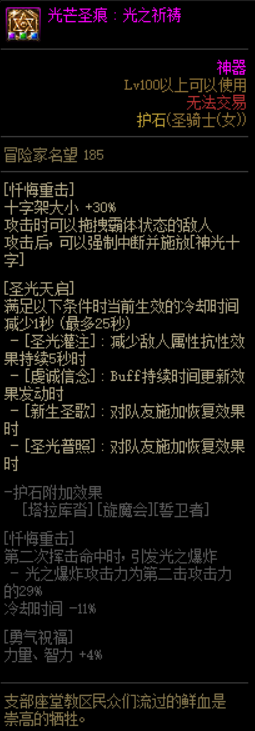 护石效果:[忏悔重击]十字架大小+30%,可托带动霸体状态的敌人,强制中断并施放[神光十字],[圣光天启]减1秒(最多25秒)满足4个技能效果;护石附加效果,忏悔重击第二次挥击对命中的敌人引发光之爆炸,爆炸的威力是第二击攻击力的29%,冷却时间-11%,[勇气祝福]力智+4%