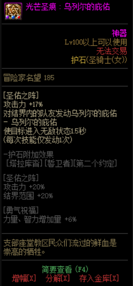 护石效果:[圣佑之阵]攻击力+17%,在阵内使队友进入无敌状态1.5秒(发动1次)护石效果,阵的攻击力+20%,范围+20%,[勇气祝福]力智+6%