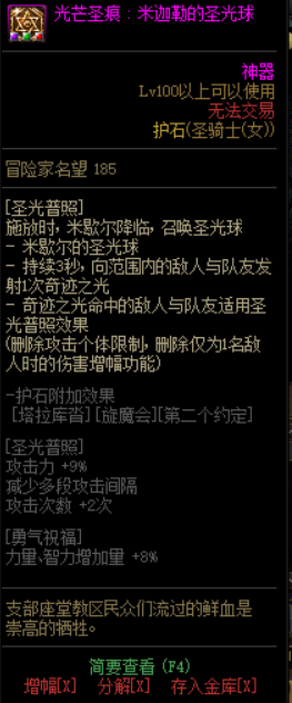 护石效果:施放时米歇尔降临,变更为米歇尔的圣光球,向队友与敌人发射1次奇迹之光适用圣光普照效果,删除攻击个体限制,删除仅为1命敌人时的伤害增幅功能;护石附加效果,[圣光普照]攻击力+9%,减少多段攻击间隔,攻击次数+2次,[勇气祝福]力智+8%