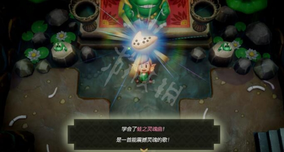 但是去山塔之前,我们要去学习第三首曲子,所以要先来到这个地方,利用钩索飞过去,找到青蛙玛穆。