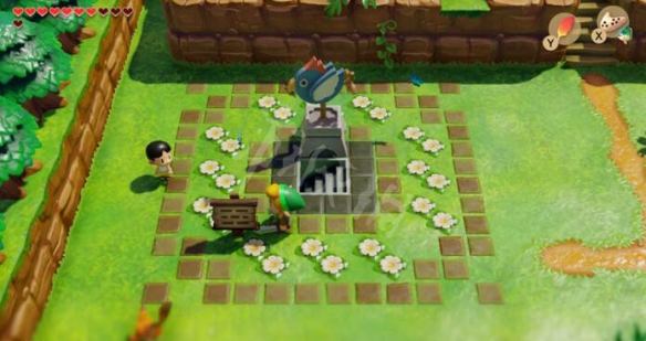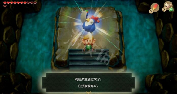 然后回到梅贝村,来到广场推动风向鸡,出现楼梯,对着骨头吹蛙之灵魂曲,然后鸡就会复活过来。
