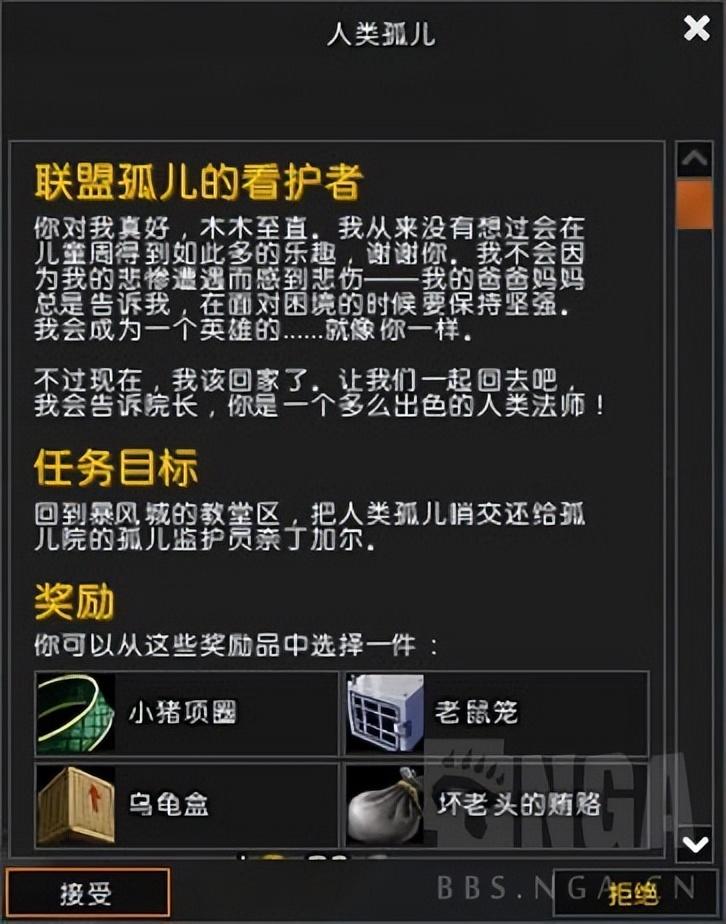 我们需要照料的孤儿向我们提出了三个请求。在暴风城孤儿院待久了的他,就像其他任何一个适龄儿童一样,渴望去探索这个神奇的世界。