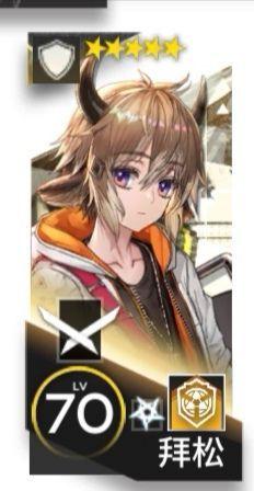 干员拜松,外号白送,是登场于喧闹法则中的重装干员。其特性是能给周围四格的干员增加防御力,且自身有嘲讽能力(更容易被攻击)。 档案中拜松是峯驰物流的少爷,被父亲派往企鹅物流学习的,结果就被卷入了几个大佬(大帝,鼠王,魏颜吾)的一场戏剧中,承受了他这个年纪不该承受的三观。