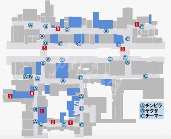 图中的ABC分别对应:A-小混混,B-流氓,C-不良帮派分子(同理,这里我用的是PS4如龙极2官方中文版的翻译,如果PC版以后的汉化补丁翻译跟这个有所出入这个我表示无能为力),红色的数字方块1-9代表的就是9个徘徊头目的出现位置,下面我按照图中标号的顺序把每位头目出现的时候古牧徒弟发给你的短信标题和每位头目对应的杂兵名称列出来