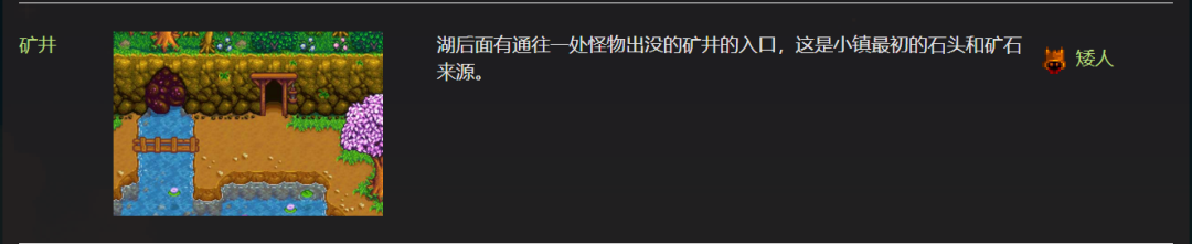 矮人住在矿洞里,但这条道路最初被一块岩石阻挡住了入口。玩家可以通过钢镐(及以上的镐)或任何类型的炸弹破坏这块岩石。