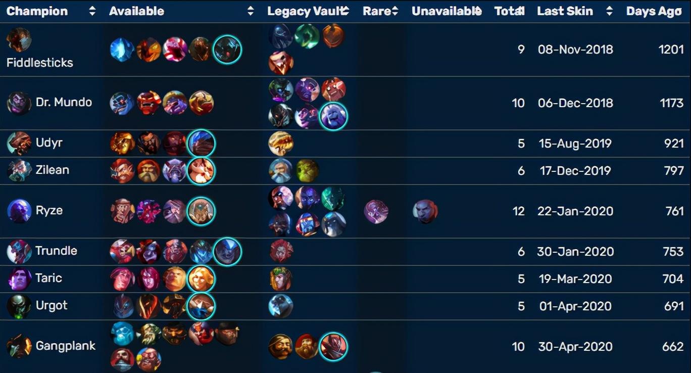 有人欢喜就有人忧,有些英雄疯狂增加新皮肤的同时,也有人被遗忘在了角落里。在皮肤领域,最不受宠的英雄是谁,这些倒霉孩子们已有多久没添新衣服了?这大概算是个冷知识吧?和皮肤相关的问题还能列出一大堆,比如你有没有想过,LOL到底有多少皮肤?