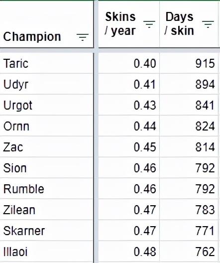 每款皮肤平均间隔最久的英雄,榜单前五依次是塔里克、乌迪尔、厄加特、奥恩和扎克。其中扎克约为平均814天出一个新皮肤,塔里克则是915,也是唯一一个超过900天的。这五个倒霉蛋之外,暂时没有其他平均间隔超过800天的英雄。而俄洛伊则是此榜单前10名中唯一的女英雄。