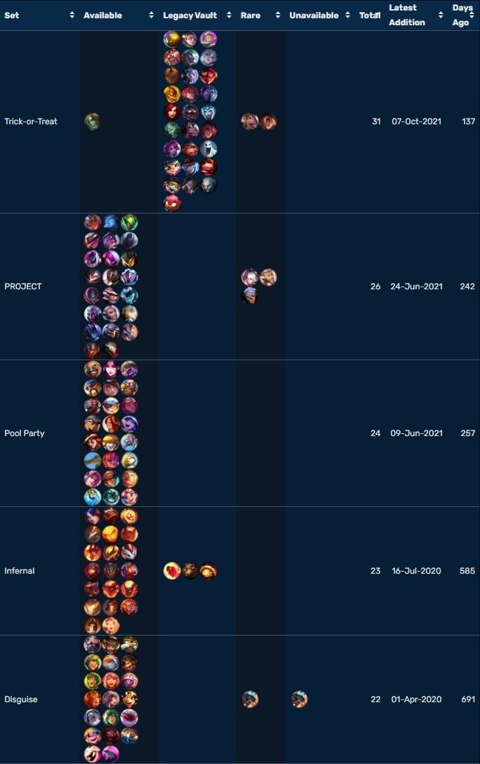 排名第一的系列不如它们出名,但更老牌,是根基扎实的峡谷传说系列(俗称万圣节系列,英文为Trick-or-Treat),共有31款皮肤,包括女枪和莫甘娜2款至臻。
