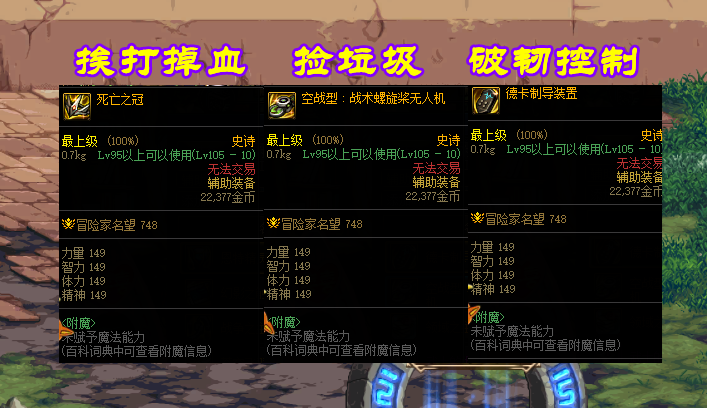 然后再说另外9件辅助装备,最让人意想不到的是,最受大众玩家热捧的“附魔左槽”,竟然是提升率最小的!不管是王冠、控制面板,还是无人机、低血左槽,理论提升都比附魔左槽更优秀。