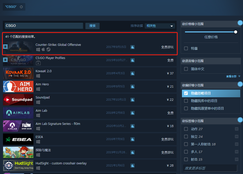 打开Steam,点击商店,在商店中搜索【CSGO】下载到电脑中。