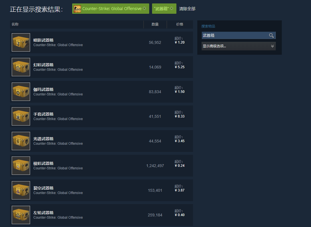 然后先在右方选择CSGO这款游戏,在游戏上方有搜索框,在搜索框中输入【武器箱】,点击搜索。就能看到左边的商品区中有许多种不同的武器箱,每种武器箱中包含的物品都是不一样的,可以点击武器箱查看详情。