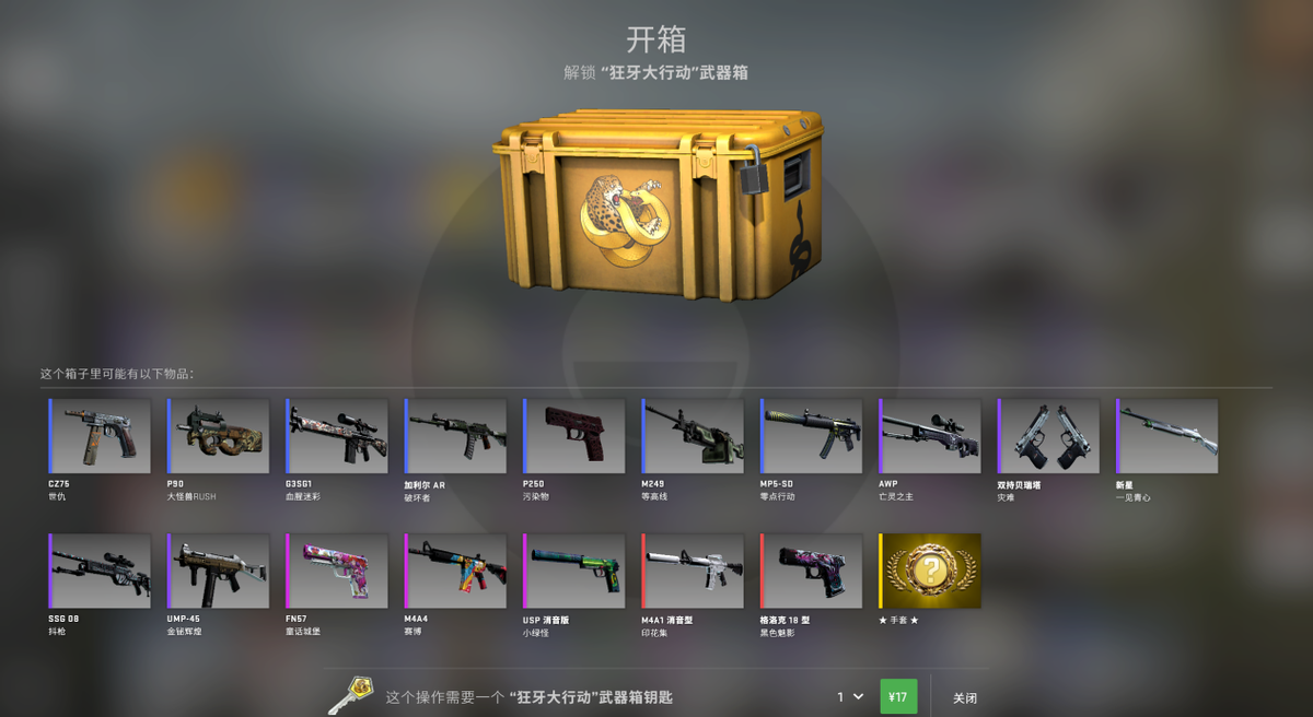 点击右下角的【17】字样,根据提示完成购买之后,再次回到开启武器箱,就可以开启啦~然后就开始自己的欧皇之路吧!